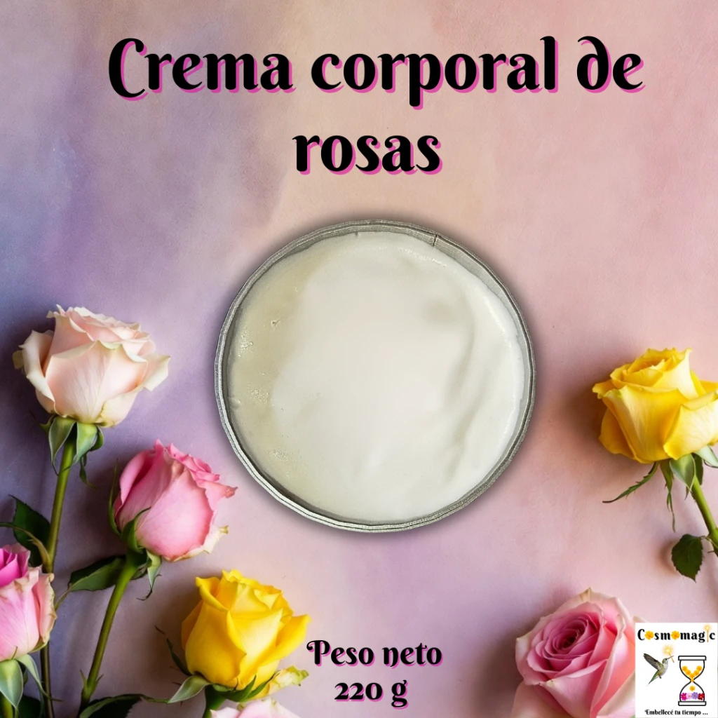 Agua destilada, aceite de almendras, cera lanette, manteca de calêndula, manteca de karité, conservante natural, aceite esencial de rosas y vitamina E.