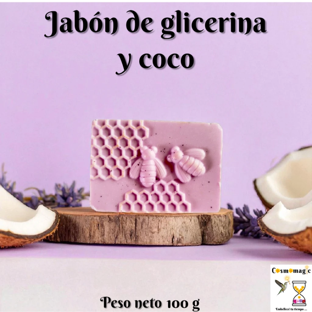 Glicerina de coco, glicerina vegetal, conservante natural, aceite esencial de lavanda, vitamina E y mica.